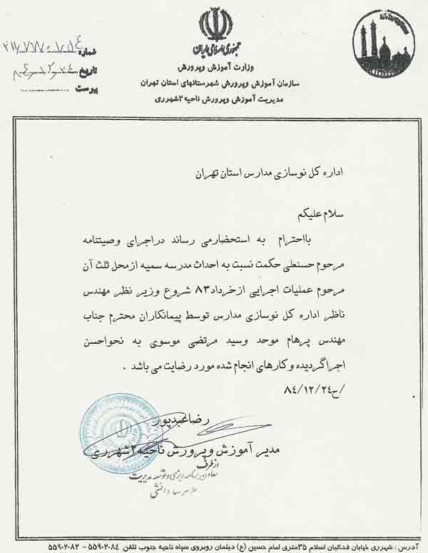 تقدیر نامه سازمان آموزش و پرورش شهرستان های استان تهران